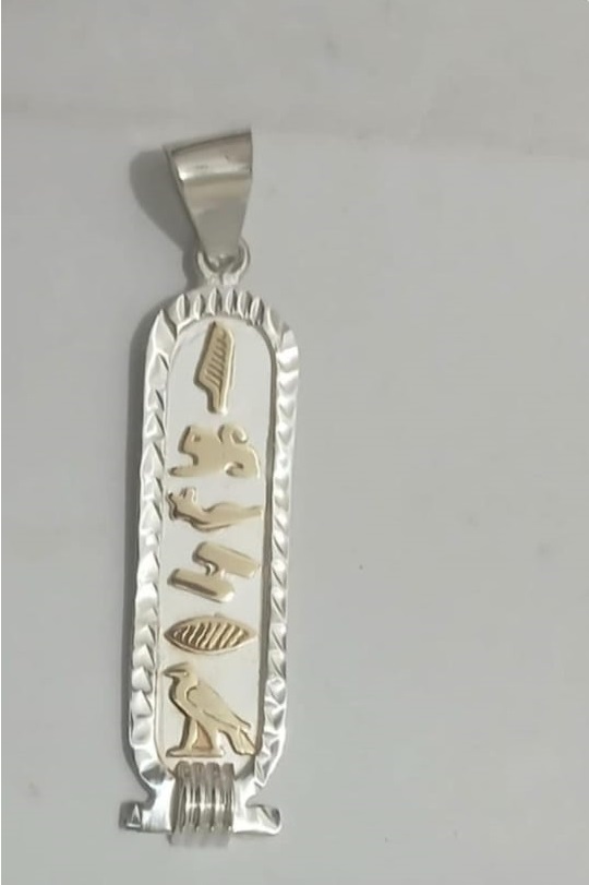 Картуш это также ценное ювелирное украшение. Он изготавливается из чистого серебра 925 пробы или серебра с краской золотого цвета. На лицевой стороне с помощью египетских иероглифов записывается ваше имя, а на обратной изображаются три символы — пожелания. Там изображены: анкх (символ вечной жизни, ключ жизни), жук скарабей (привлекает удачу и дарует счастье) и всевидящее око ( оберег от чар и сглаза). Именной сувенир покажет вашу заботу о человеке.